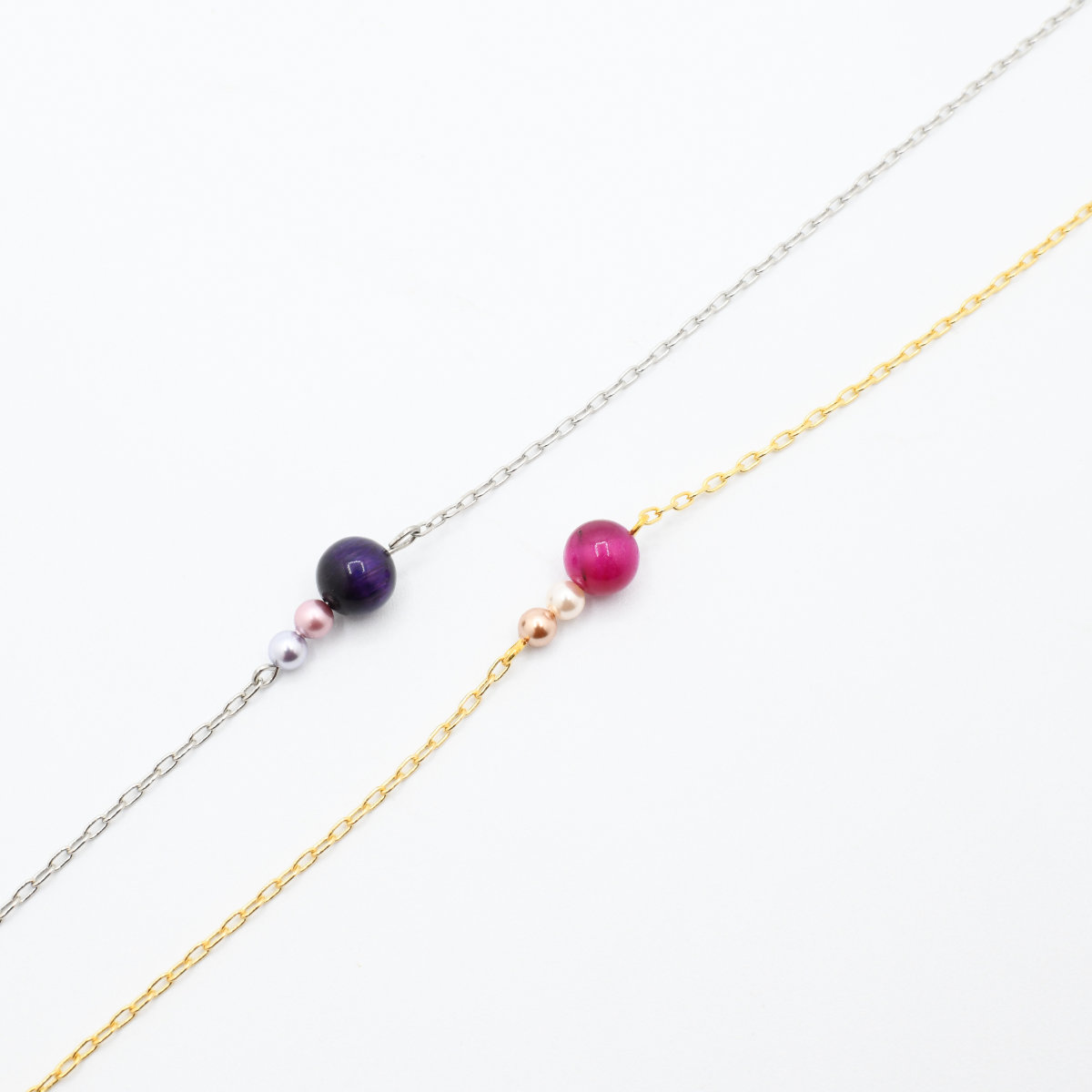 つやゴールド、つやシルバーの金属チェーンが全体をエレガントに引き立てます。
